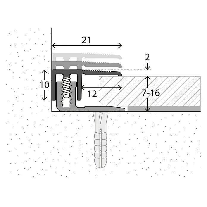 Das LOGOCLIC Abschlussprofil ist für die Verarbeitung von Laminat und Parkett mit Belagstärken von 7 – 16 mm geeignet. Das bewährte Schraubprofilsystem ist schnell und einfach zu verarbeiten. Zunächst wird das Basisprofil auf dem Untergrund verschraubt und der Boden verlegt. Danach wird das Oberprofil aufgelegt. Die beiden Stege greifen über den Schraubkanal des Basisprofils, mit den beigefügten Schrauben wird es im Schraubkanal befestigt.