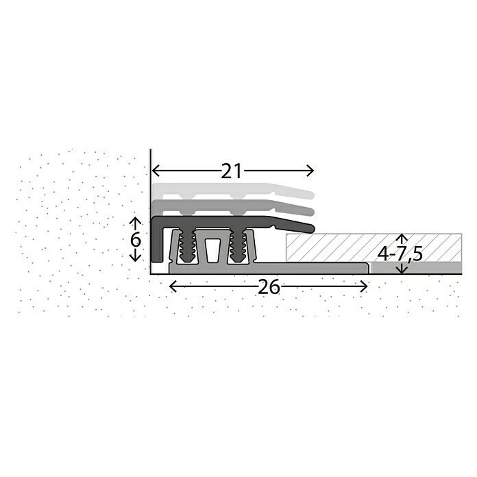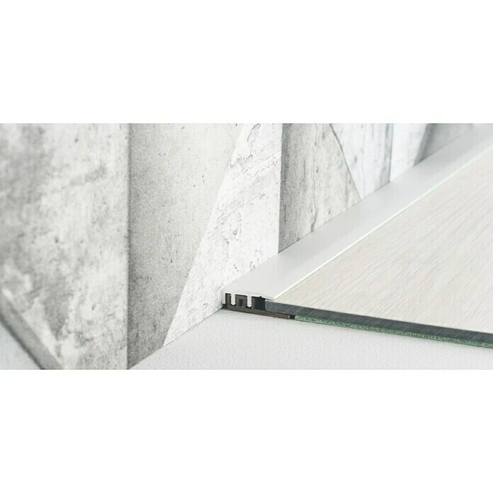 Das LOGOCLIC Abschlussprofil wurde speziell für schwimmend verlegte Designbeläge von 4 – 7,5 mm entwickelt. Die verzahnten Profilstege des Oberprofils rasten sicher in den trapezförmigen Aufnahmen des Basisprofils ein. Dabei kann das Oberprofil leicht verkippen und sich variabel in Höhe und Neigung dem Bodenbelag anpassen. Das schmale, flache Profil überzeugt durch eine besonders schöne Optik und bietet gleichzeitig großzügige Dehnungsfugen für die Dimensionsschwankungen des Bodenbelages. Bei Bedarf kann das Oberprofil gelöst und anschließend wieder im Basisprofil verankert werden. Die Montage ist schnell und einfach. Zunächst wird das Basisprofil mit Montage- oder einem Zwei-Komponenten-Kleber auf dem Untergrund verklebt. Nach der Bodenverlegung wird das Oberprofil einfach eingeclipst. Hinweis: Passender Klebstoff ist separat zu erwerben.