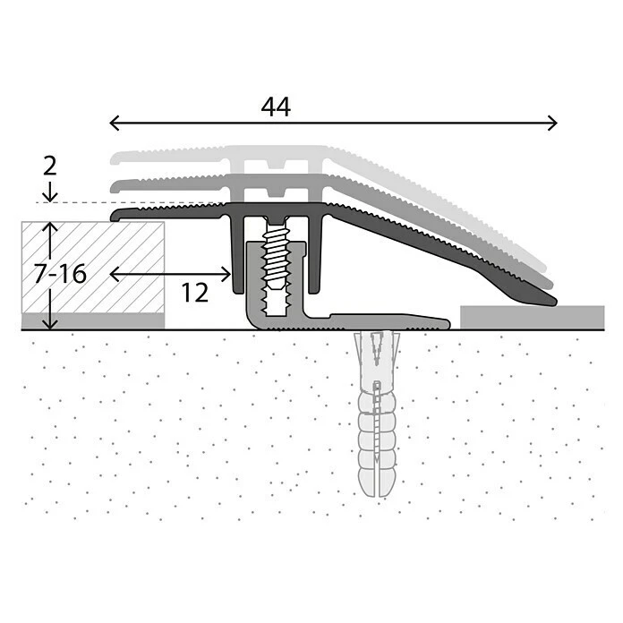 Das LOGOCLIC Anpassprofil ist für die Verarbeitung von Laminat und Parkett mit Belagstärken von 7 – 16 mm geeignet. Das bewährte Schraubprofilsystem ist schnell und einfach zu verarbeiten. Zunächst wird das Basisprofil auf dem Untergrund verschraubt und der Boden verlegt. Danach wird das Oberprofil aufgelegt. Die beiden Stege greifen über den Schraubkanal des Basisprofils, mit den beigefügten Schrauben wird es im Schraubkanal befestigt.