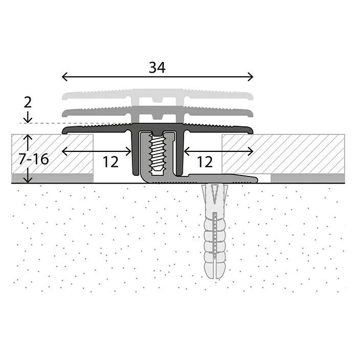 Das LOGOCLIC Übergangsprofil ist für die Verarbeitung von Laminat und Parkett mit Belagstärken von 7 – 16 mm konstruiert. Das bewährte Schraubprofilsystem ist schnell und einfach zu verarbeiten. Zunächst wird das Basisprofil auf dem Untergrund verschraubt und der Boden verlegt. Danach wird das Oberprofil aufgelegt. Die beiden Stege greifen über den Schraubkanal des Basisprofils, mit den beigefügten Schrauben wird es im Schraubkanal befestigt.