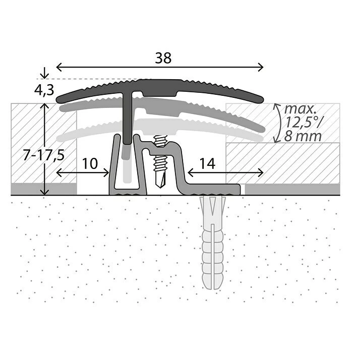 Das LOGOCLIC Übergangsprofil ist für die Verarbeitung von Laminat und Parkett mit Belagstärken von 7 – 17,5 mm konstruiert. Es überzeugt durch die zeitsparende und einfache Verarbeitung. Zunächst wird das Basisprofil auf dem Untergrund verschraubt und der Bodenbelag verlegt. Dabei ist eine ausreichende Dehnungsfuge zu berücksichtigen. Das Oberprofil passt sich stufenlos dem Bodenbelag an. Auch bei starken Niveauunterschieden schließt es automatisch dicht an beiden Seiten ab. Mit den beigefügten Selbstbohrschrauben wird das Oberprofil im Basisprofil befestigt. Der Rundumkontakt der Schraube garantiert einen optimalen Kraftschluss, auch nach mehrjähriger Druck- und Zugbelastung entsteht kein Spiel. Aufgrund der starken, dauerhaften Verbindung ist das Profilsystem für höchste Belastungen geeignet.