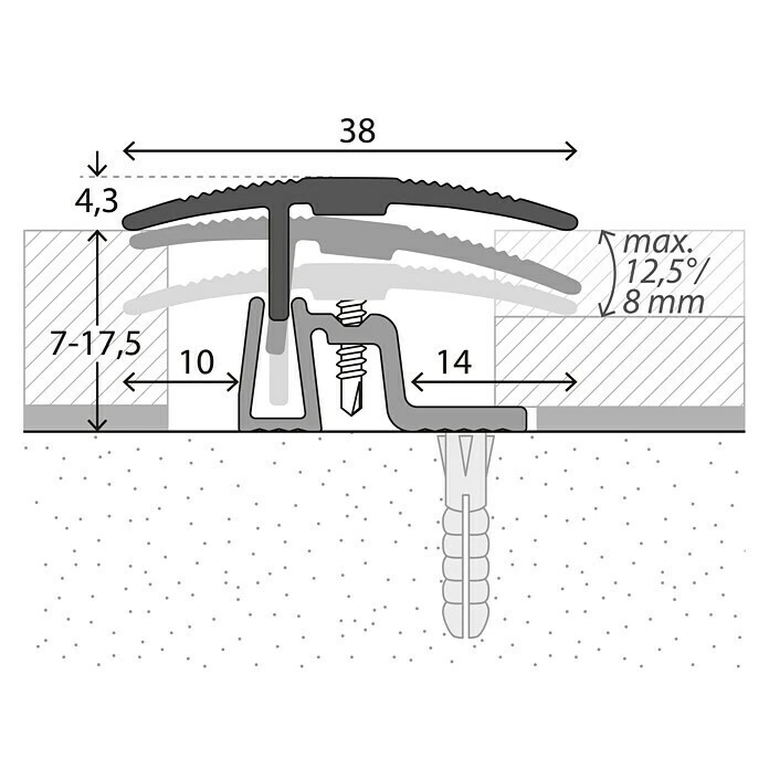 Das LOGOCLIC Übergangsprofil ist für die Verarbeitung von Laminat und Parkett mit Belagstärken von 7 – 17,5 mm konstruiert. Es überzeugt durch die zeitsparende und einfache Verarbeitung. Zunächst wird das Basisprofil auf dem Untergrund verschraubt und der Bodenbelag verlegt. Dabei ist eine ausreichende Dehnungsfuge zu berücksichtigen. Das Oberprofil passt sich stufenlos dem Bodenbelag an. Auch bei starken Niveauunterschieden schließt es automatisch dicht an beiden Seiten ab. Mit den beigefügten Selbstbohrschrauben wird das Oberprofil im Basisprofil befestigt. Der Rundumkontakt der Schraube garantiert einen optimalen Kraftschluss, auch nach mehrjähriger Druck- und Zugbelastung entsteht kein Spiel. Aufgrund der starken, dauerhaften Verbindung ist das Profilsystem für höchste Belastungen geeignet.
