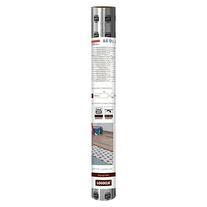 Die LOGOCLIC Dampfbremsfolie Aquaprotect ist eine äußerst verlegefreundliche Polyethylenfolie. Sie schützt Laminat, Fertigparkett und Korkboden vor aufsteigender Feuchtigkeit. Bei Verlegung auf mineralischen Untergründen (Estrich, Beton, Asphalt) ist sie zwingend vorgeschrieben. Die Bahnen werden ca. 20 cm überlappend verlegt und mit Aluklebeband verklebt.