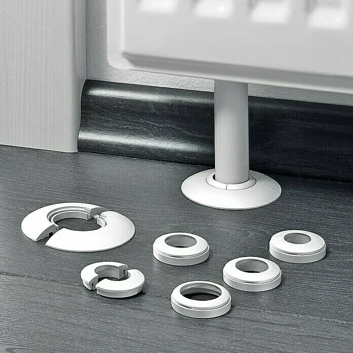 Die Rohrrosette von LOGOCLIC dient der perfekten Abdeckung der Dehnungsfuge um das Heizungsrohr. Sie besteht aus langlebigem Kunststoff und fügt sich dezent in den Raum ein. Mit den drei Adaptern für 15, 18 und 22 mm lässt sich ganz einfach der richtige Durchmesser erzielen.