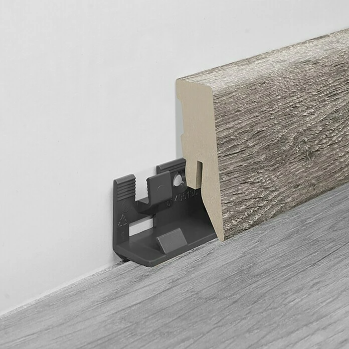 Die Sockelleiste von LOGOCLIC ist eine moderne und geradlinige MDF-Leiste zur Bodengestaltung passend zum dekorgleichen Fußboden. Die benötigte Dehnungsfuge zur Wand wird optimal mit einer Tiefe von 18 mm überdeckt und das Bodendesign konsequent fortgeführt. Das Ziel: Ein rundum harmonisches Bild bis hin zum Wandabschluss. Separat erhältliche Montageclips garantieren eine einfache Montage und lassen eine versteckte Kabelverlegung zu.