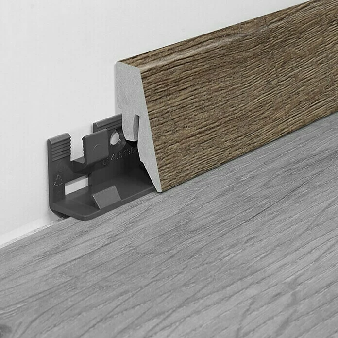 Die Sockelleiste K40 C von LOGOCLIC ist eine Abschlussleiste aus MDF-Material in moderner und geradliniger Form. Das Dekor ist auf das jeweilige Laminat abgestimmt. Somit entsteht ein rundum harmonisches Bild bis hin zum Wandabschluss. Separat erhältliche Montageclips garantieren eine einfache Montage und lassen eine versteckte Kabelverlegung zu.