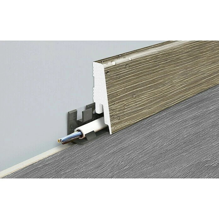 Die LOGOCLIC Sockelleiste K58 C ist eine hochwertige, moderne und geradlinige Abschlussleiste aus Kunststoff für die perfekte Bodengestaltung passend zum jeweiligen Element Hartvinylboden. Die benötigte Dehnungsfuge zur Wand wird optimal überdeckt und das Bodendesign konsequent fortgeführt. Das Ziel ist ein rundum harmonisches Bild bis hin zum Wandabschluss. Separat erhältliche Montageclips garantieren eine einfache Anbringung und lassen eine versteckte Kabelverlegung zu.