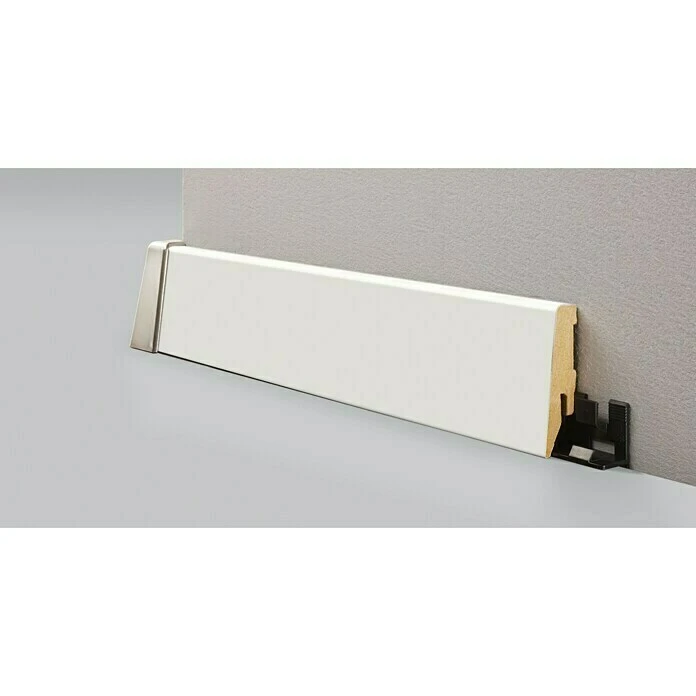Die LOGOCLIC Sockelleiste K58 C ist eine hochwertige, moderne und geradlinige MDF-Abschlussleiste zur Wohnraumgestaltung. Die benötigte Dehnungsfuge zur Wand wird optimal mit einer Tiefe von 18 mm überdeckt und das Bodendesign konsequent fortgeführt. Das Ziel ist ein rundum harmonisches Bild bis hin zum Wandabschluss. Mit den im Lieferumfang enthaltenen einfach zu montierenden Kunststoffclips wird die Leiste unsichtbar an der Wand befestigt. Die Verlegung eines 4-poligen Kabels im Clip ist ebenfalls möglich.