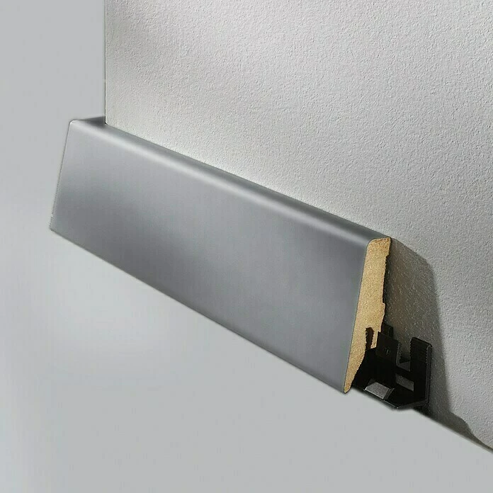 Die Sockelleiste von LOGOCLIC® mit ihrer klaren Form und hochwertigen Verarbeitung ist ein ausdrucksvolles Element für das designorientierte Einrichten. Die aus massivem Trägermaterial gefertigte Leiste ist mit einer Dekorfolie in Alu-Farbton ummantelt. Separat erhältliche Montageclips garantieren eine einfache Befestigung und lassen eine versteckte Kabelverlegung zu.