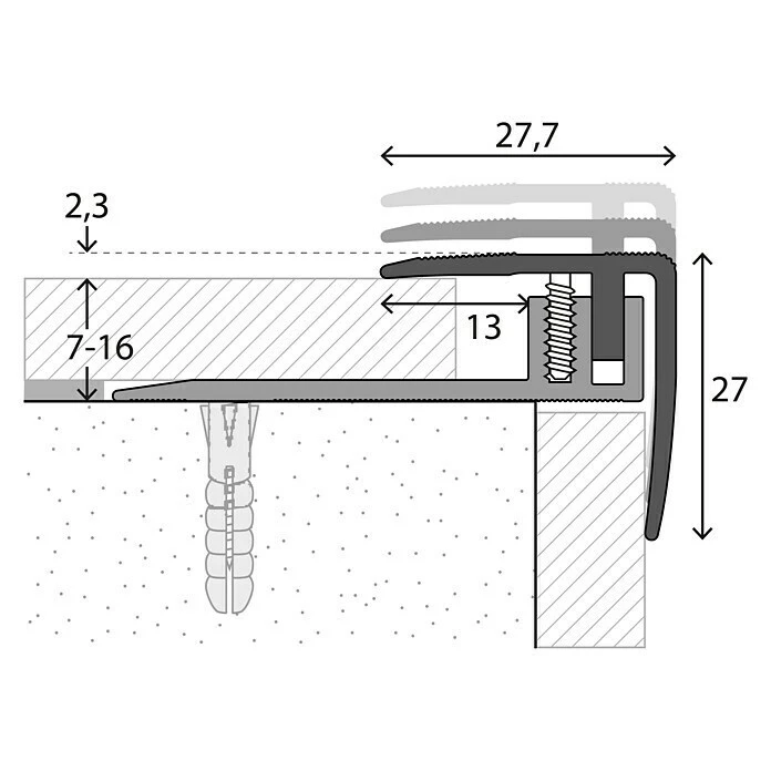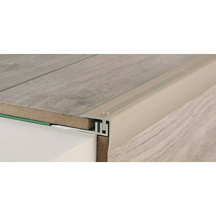 Das LOGOCLIC Treppenkantenprofil ist für die Verarbeitung von Laminat und Parkett mit Belagstärken von 7 – 16 mm geeignet. Das bewährte Schraubprofilsystem ist schnell und einfach zu verarbeiten. Zunächst wird das Basisprofil auf dem Untergrund verschraubt und der Boden verlegt. Danach wird das Oberprofil aufgelegt. Die beiden Stege greifen über den Schraubkanal des Basisprofils, mit den beigefügten Schrauben wird es im Schraubkanal befestigt.