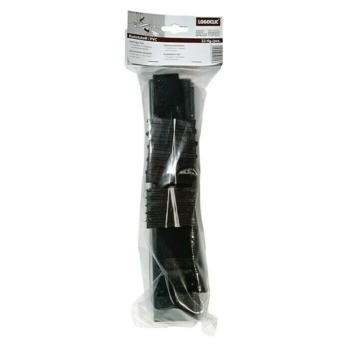 Das LOGOCLIC Verlegeset erleichtert das Verlegen von Hartbelägen mit Nut- und Federsystem, welche schwimmend verlegt werden. Es besteht aus einem Schlagklotz, einem stabilen Zugeisen und 20 Kunststoffkeilen. Um die erforderlichen Abstände zur Wand korrekt ausrichten zu können, wurden die Distanzkeile mit einer praktischen Zahnung versehen.