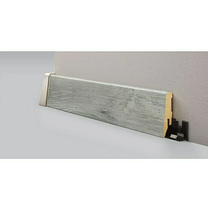 Die MyStyle Sockelleiste verfügt über eine moderne Formgebung. Sie ist 58 mm hoch und überdeckt 19 mm Bodenfläche. Mit den im Lieferumfang enthaltenen einfach zu montierenden Kunststoffclips wird die Leiste unsichtbar an der Wand befestigt. Die Verlegung eines 4-poligen Kabels im Clip ist ebenfalls möglich.