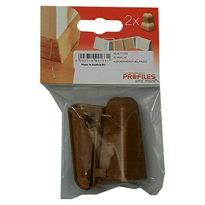 Die Außenecke von Profiles and more besteht aus hochwertigem Kunststoff und erleichtert die Sockelleistenmontage. Die Ecke wird einfach zwischen die Enden der rechtwinkelig geschnittenen Leisten gesteckt. Dadurch ist kein komplizierter Gehrungsschnitt mehr notwendig und die Leistenecke ist gegen Stöße geschützt.