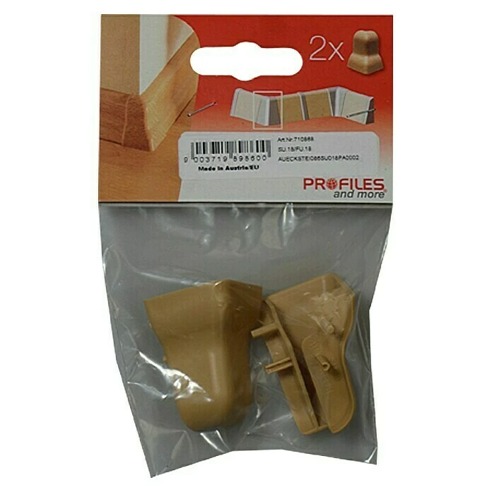 Die Außenecke von Profiles and more besteht aus hochwertigem Kunststoff und erleichtert die Sockelleistenmontage. Die Ecke wird einfach zwischen die Enden der rechtwinkelig geschnittenen Leisten gesteckt. Dadurch ist kein komplizierter Gehrungsschnitt mehr notwendig und die Leistenecke ist gegen Stöße geschützt.