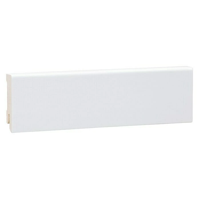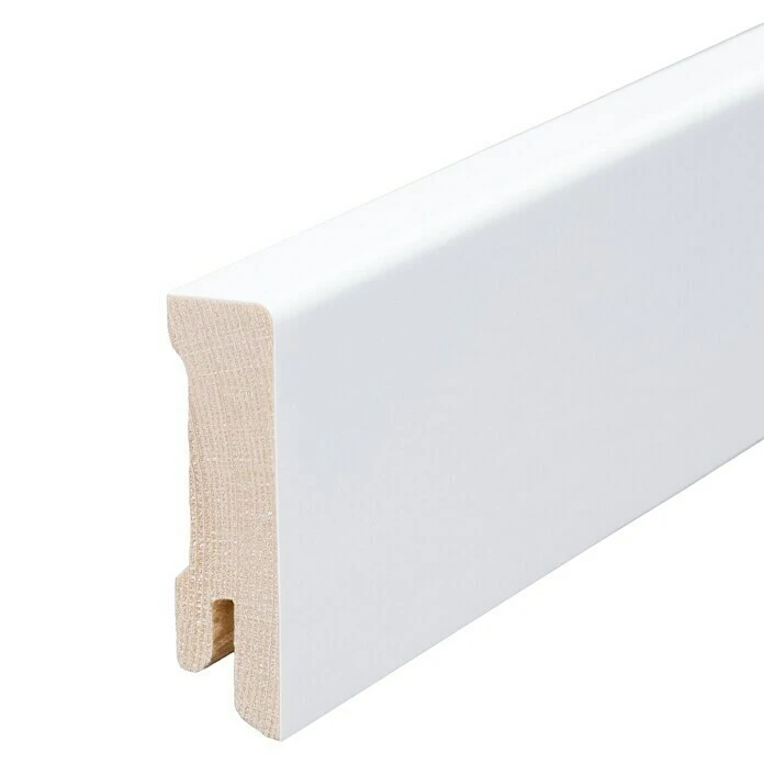 Die Sockelleiste aus einem hochwertigen Fichtenholzkern ist von einer Starkfolie in klarem, reinem Weiß ummantelt. Das Ergebnis ist eine besonders robuste, langlebige Leiste, die mit einem puristischen Look punktet. Dieser wird durch ihr modernes, minimal gerundetes Profil noch verstärkt, da dieses zu vielerlei Einrichtungsstilen passt. Einen praktischen Vorteil bietet die Clip-Nut der Sockelleiste. Damit ist eine einfache und verdeckte Montage möglich.